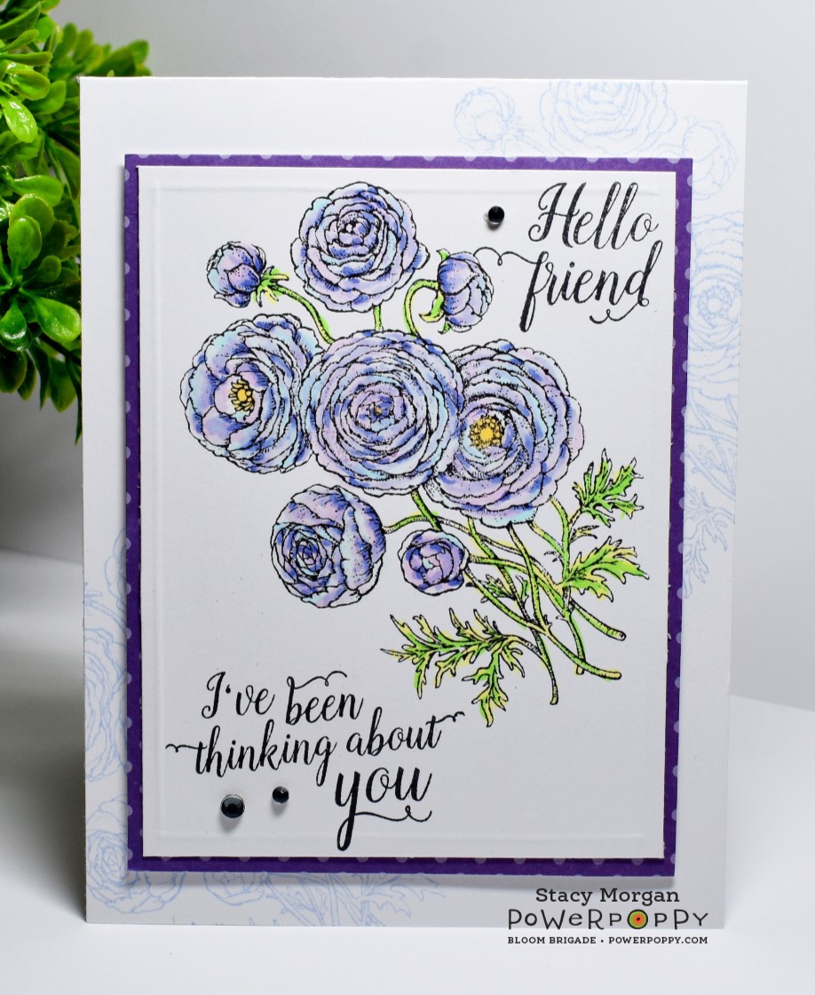 Good morning. This is a quick card using Dynamic Duo Foxglove and Ranunculus today. The base has the flowers lightly stamped on the two edges for some background shadowing. I then stamped and colored the flowers on the main panel using various Copic markers.