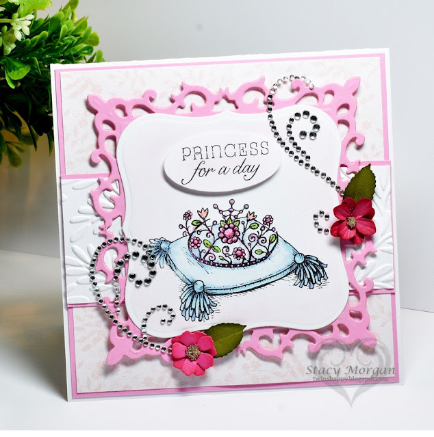 My second card is using the crown on the pillow form the set colored with Copics as well. Die cut with a decorative square die and layered onto some embossed layers. Flourished jewels on this one and more flowers.